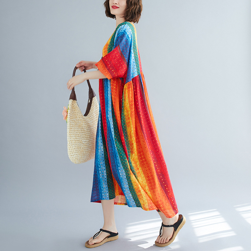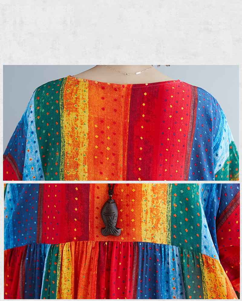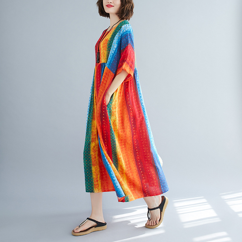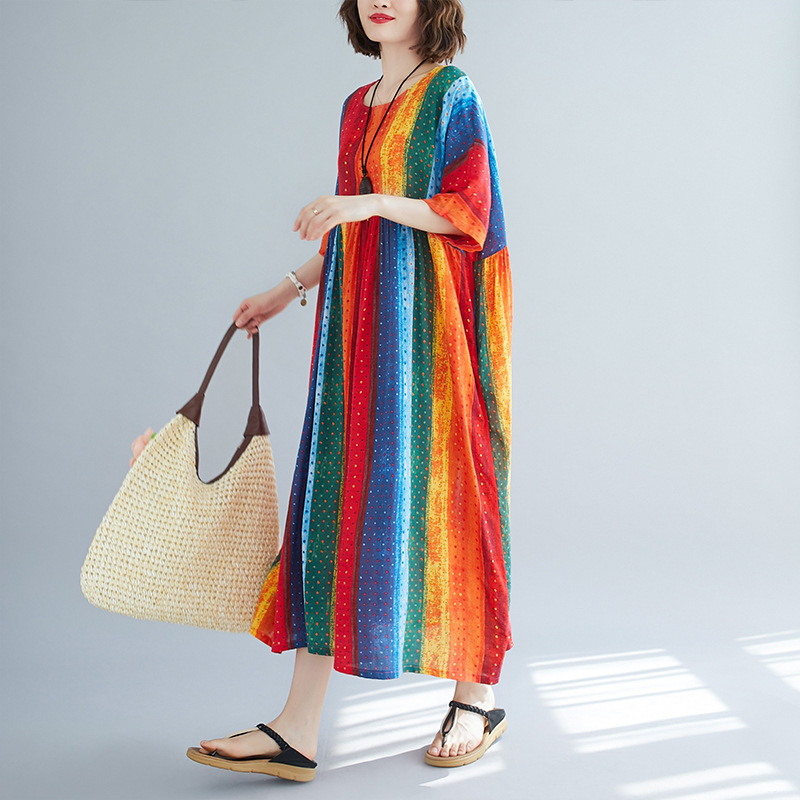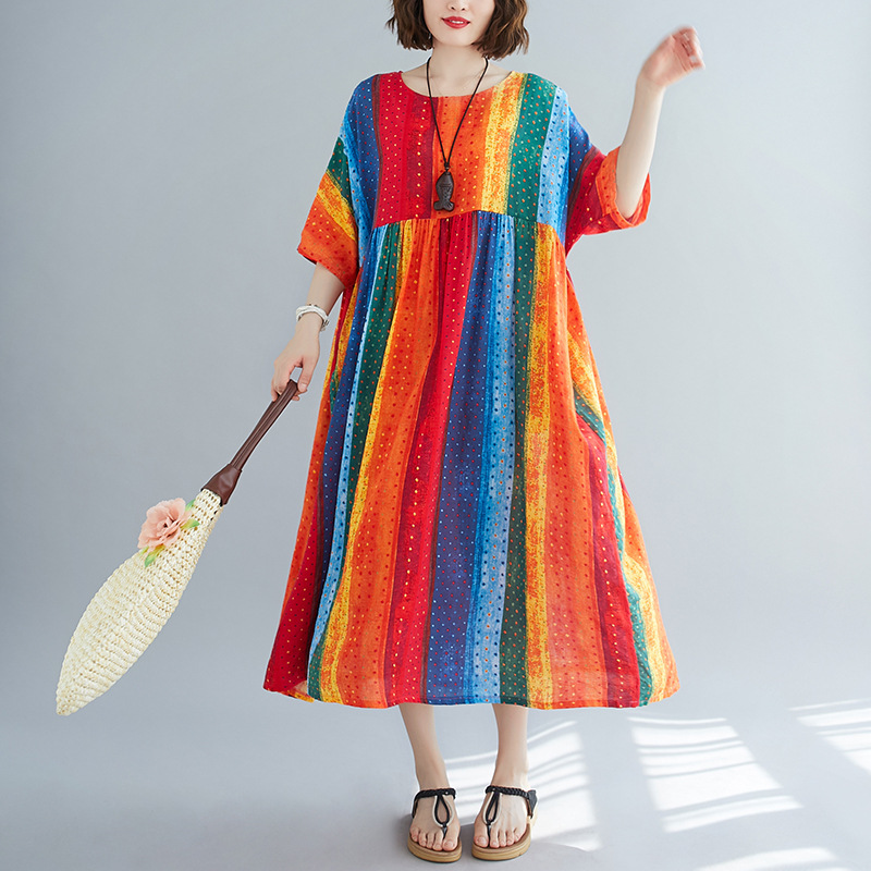 Literary Style Striped Print Short-sleeved Round Neck Swing Dress